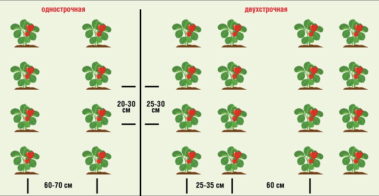 Двухрядная (ленточная) посадка: Два ряда располагаются близко друг к другу (25–40 см), а между такими сдвоенными лентами оставляют широкий проход (60–100 см). Часто кусты сажают в шахматном порядке .