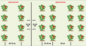Однорядная посадка: Кусты высаживаются в одну линию. Расстояние между растениями — 20–35 см, а иногда и больше (в зависимости от сорта), между рядами (если их несколько) — 60–100 см.
